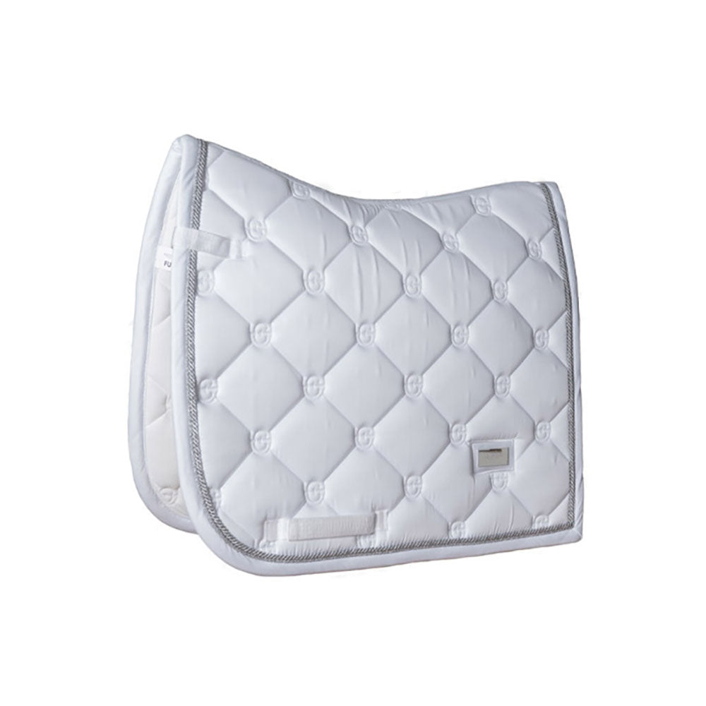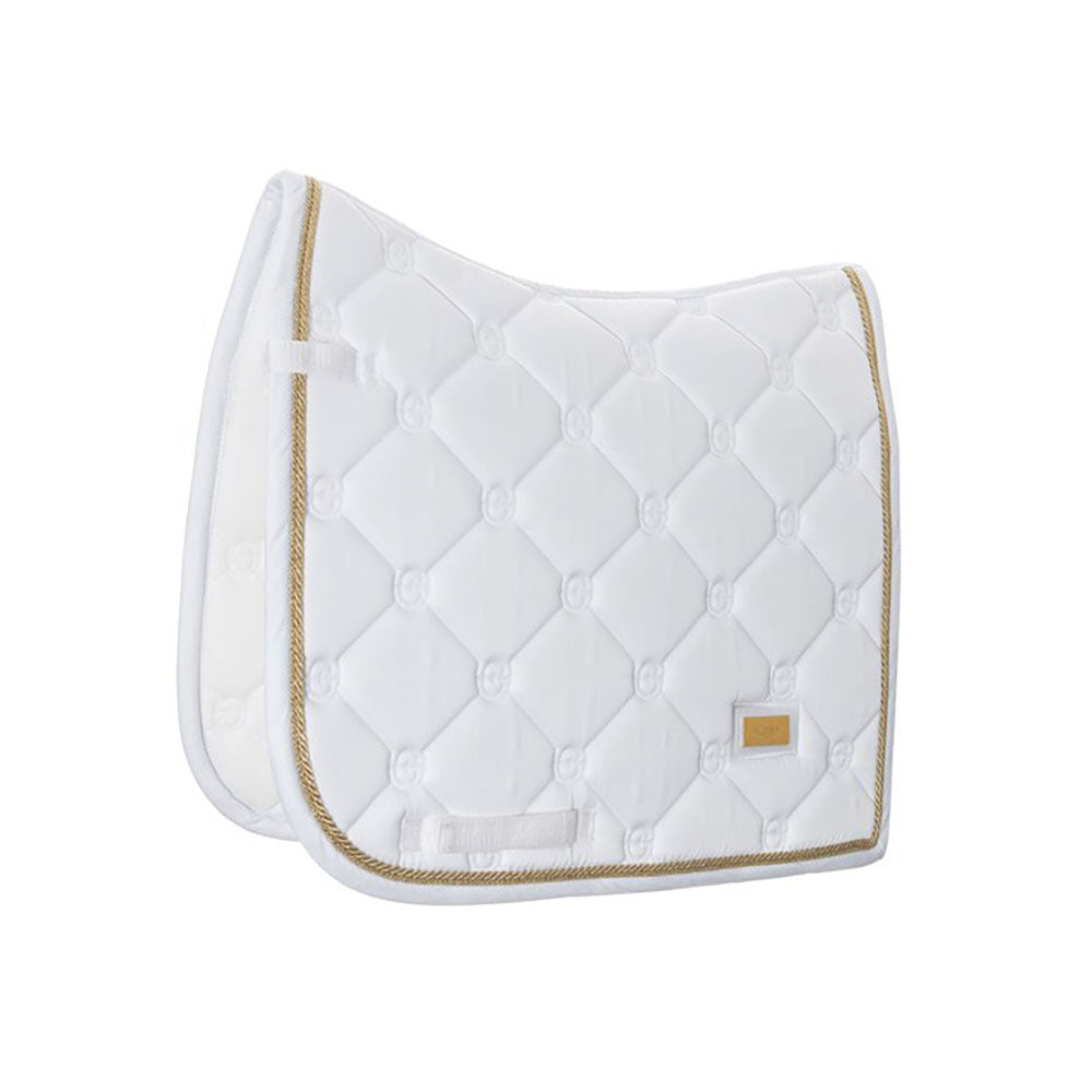 Snyggt dressyrschabrak i vitt med vackra gulddetaljer ( eller silverdetaljer) och mönster i Equestrian Stockholm loggan.