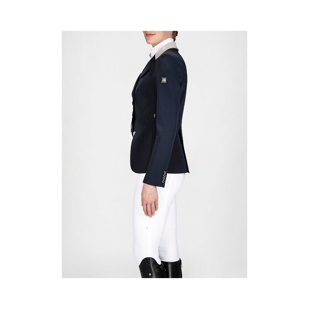 ratsastusfrakki, lyhyt frakki, Equiline frakki, naisten kilpailufrakki, X-COOL EVO materiaali, hengittävä frakki, joustava ratsastustakki, elegantti ratsastusfrakki, kisatakki, ratsastuskilpailutakki, vettä hylkivä frakki, timanteilla koristeltu frakki, naisten ratsastustakki, ratsastusvaatteet, tekninen frakki, Equiline naisten vaatteet.