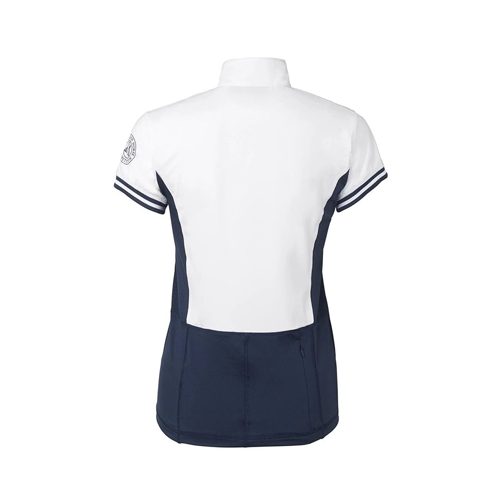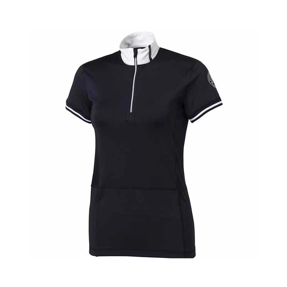 Paidassa on korkea, litteä kilpailukaulus, joka toimii hyvin yksinään tai solmion kanssa. Edessä on metallinen vetoketju ja leuan suojaus, joka ehkäisee hankausta. Ribbineuloksiset hihat pitävät paidan napakasti paikoillaan. Kaksivärinen muotoilu antaa sporttisen ilmeen ja Mountain Horse -logo hihassa viimeistelee tyylikkään vaikutelman.